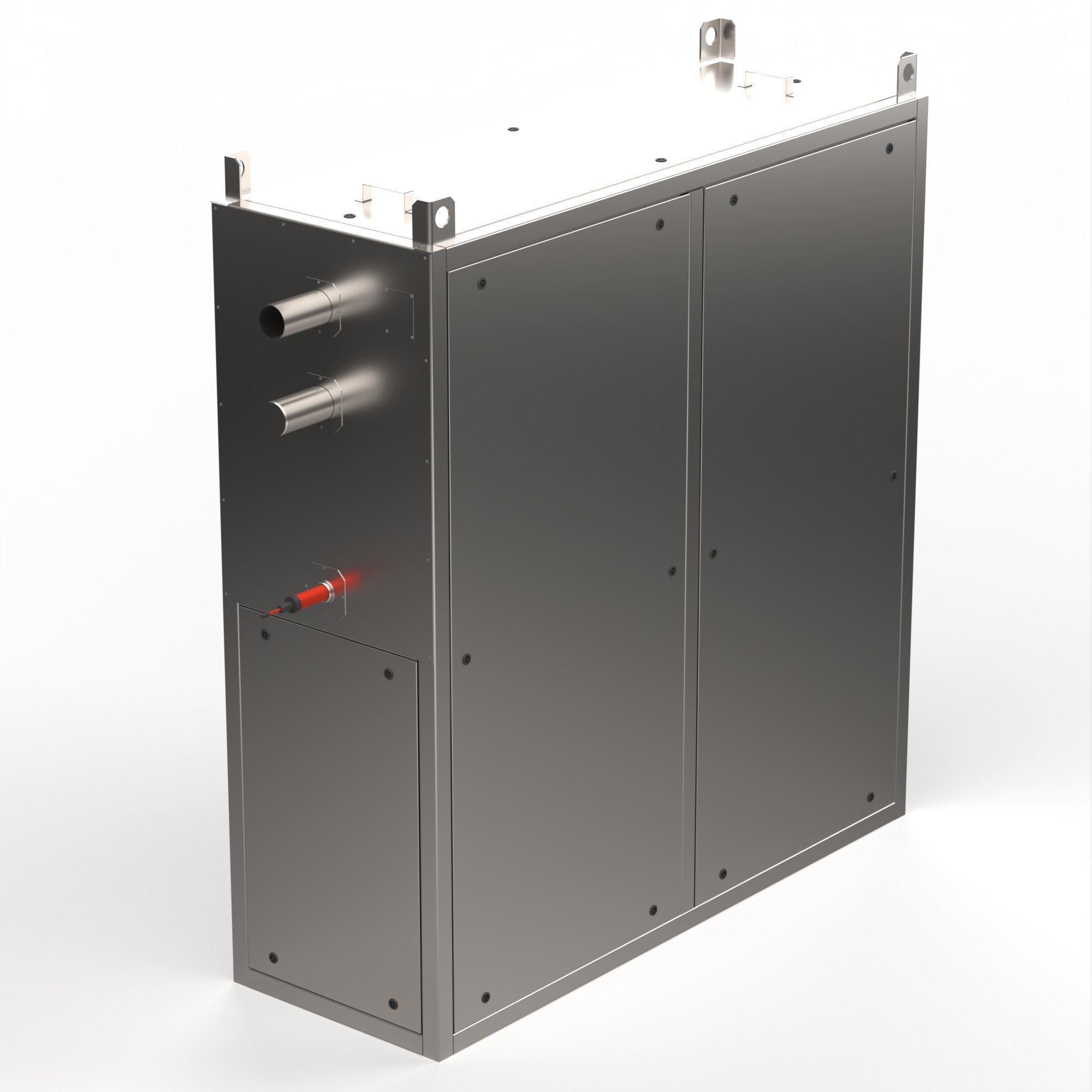 Пленочный испаритель предназначен для получения ледяной воды, которая используется в качестве хладоносителя в различных отраслях промышленности. Пленочные испарители – аппараты «открытого» типа с высоким коэффициентом теплопередачи и малой емкостью хладагента. Модуль охлаждения представляет собой конструкцию с вертикально установленными теплообменными панелями из нержавеющей стали и распределительного бака. Вода из распределительного бака равномерно стекает по поверхности теплообменных панелей в виде тонкой пленки, в располагаемый ниже накопительный бак. При этом вода охлаждается до температур, близких к 0°C, без риска размораживания теплообменного аппарата. Требуемый объем подачи воды обеспечивается конструкцией распределительного бака. Панель теплообменная представляет собой, два листа нержавеющей стали сваренных между собой контактной сваркой и сплошным швом. Качество сварных швов исключает возможность возникновения межкристаллической коррозии. Определенное количество точек сварки панели, обеспечивая высокую турбулентность потока при всегда высоком числе Рейнольдса, приводит к более высоким коэффициентам теплопередачи по сравнению с другими теплообменниками. И что самое главное, обеспечивает равномерное распределение водяной пленки на поверхности панели, исключающее ручьевое течение. После выполнения сварочных операций, избыточным давлением формируются выпукло-вогнутые поверхности, в результате чего, в теплообменной панели образуются полости в виде каналов, по которым проходит хладагент. Конструкция панели характеризуется малой емкостью (не более 5 дм3), что позволяет значительно сократить затраты на хладагент.