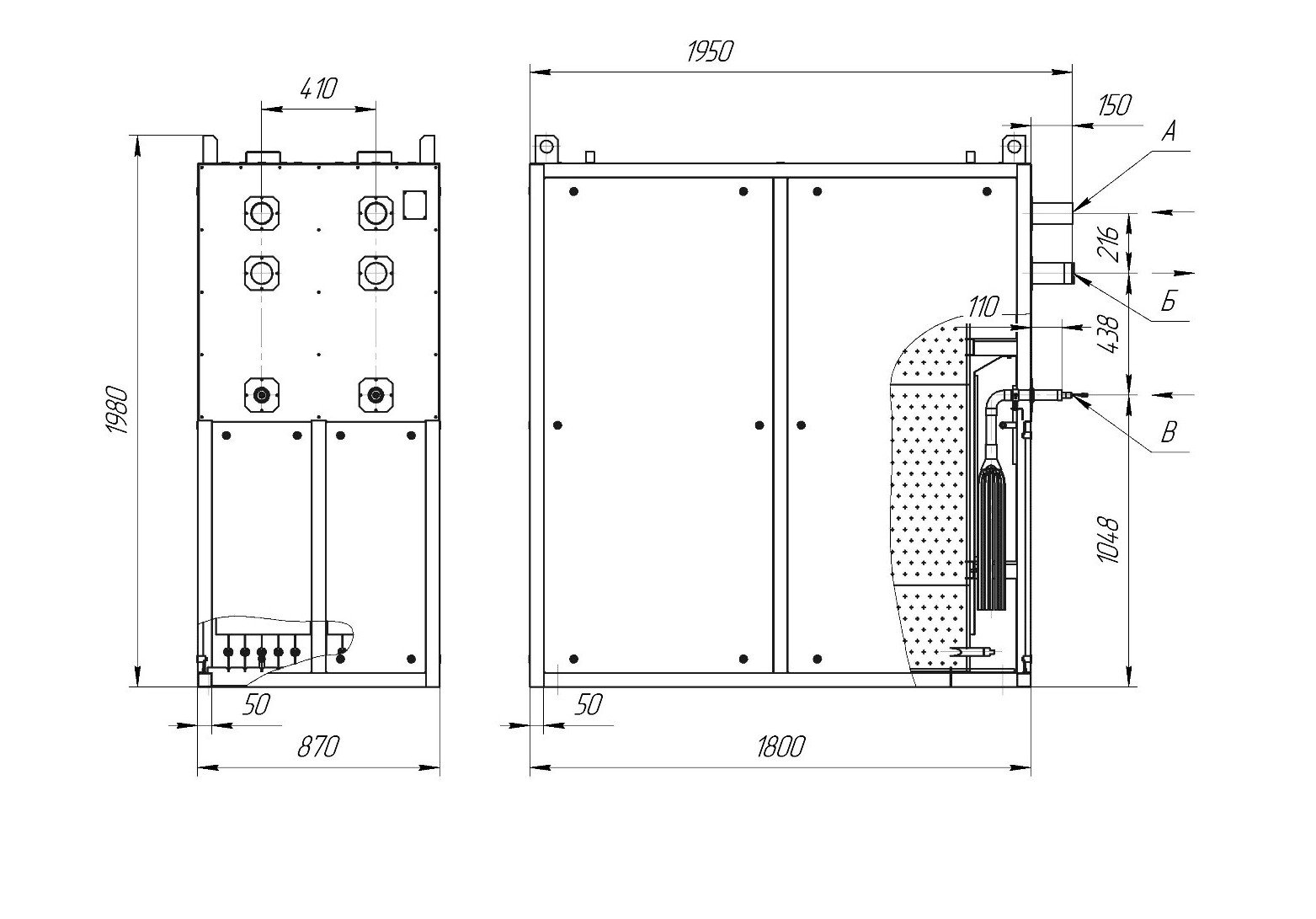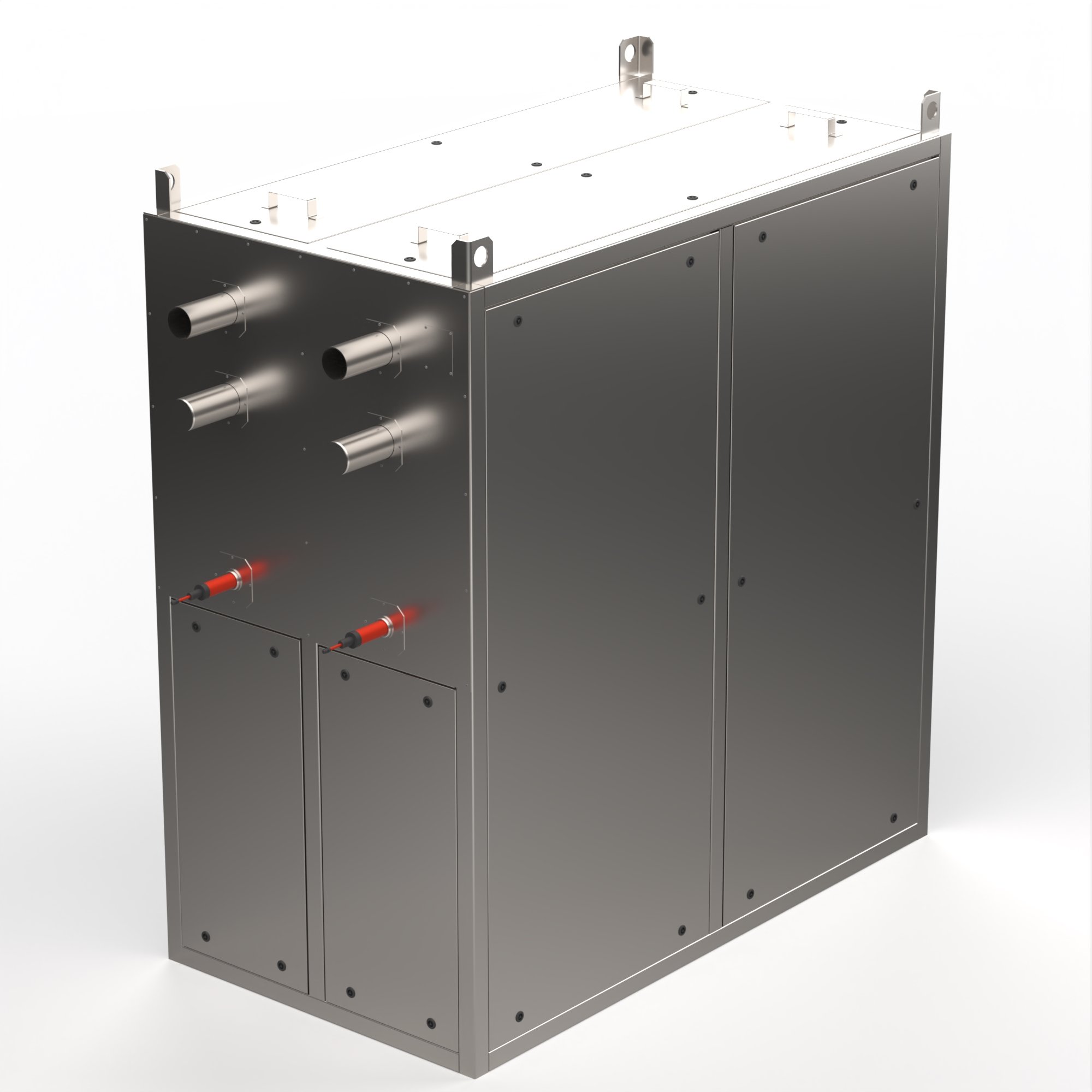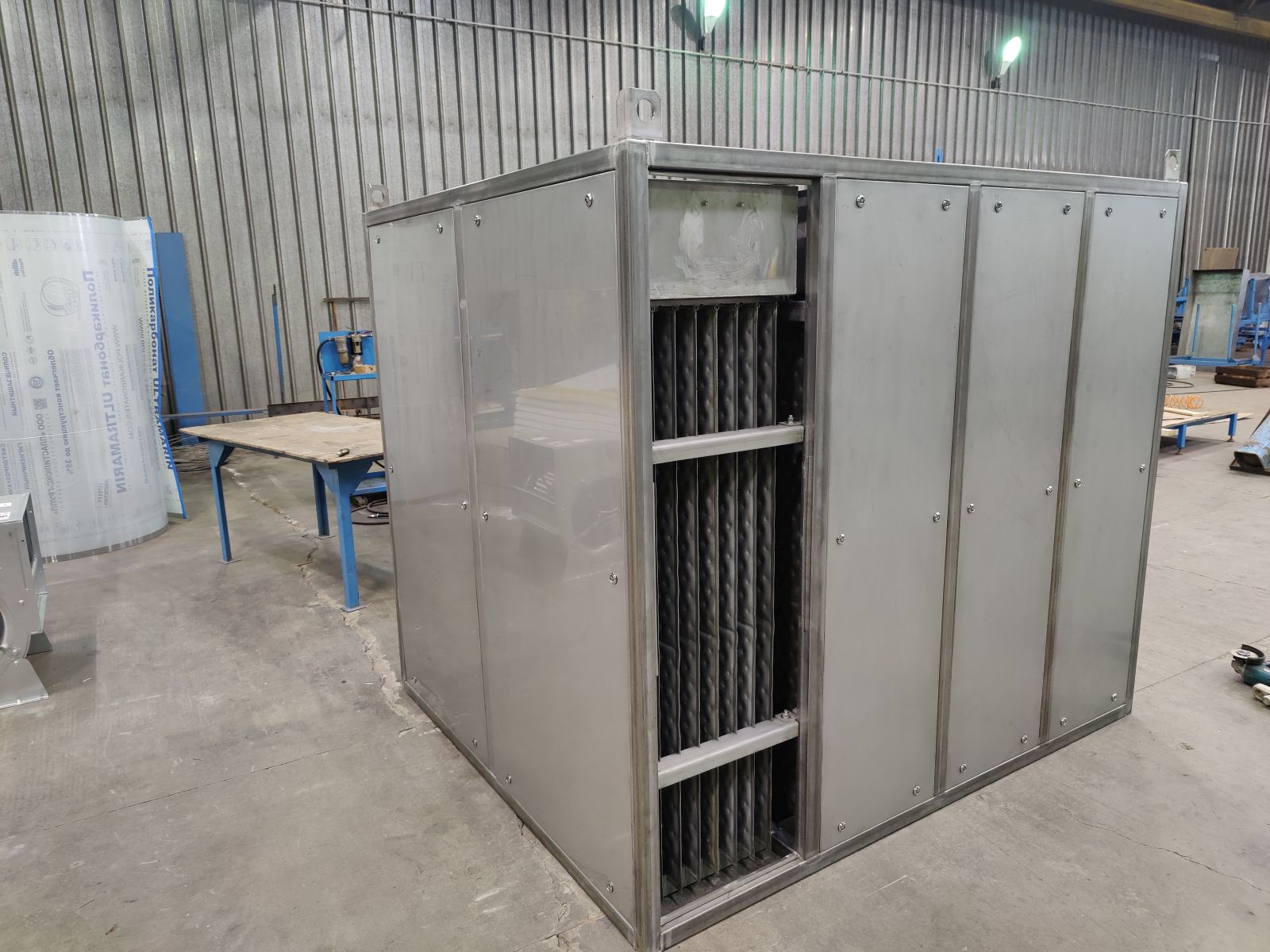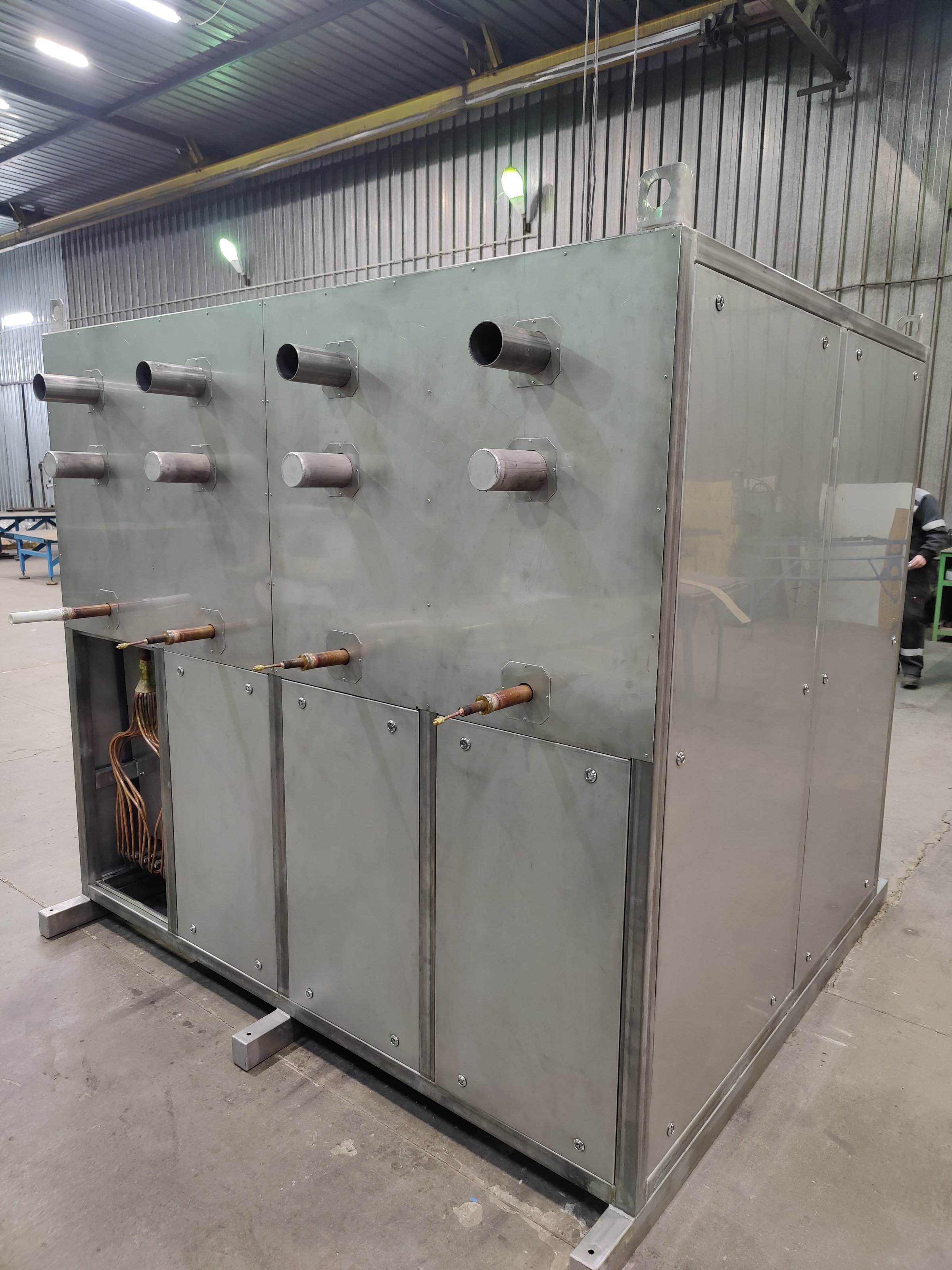 Пленочный испаритель предназначен для получения ледяной воды, которая используется в качестве хладоносителя в различных отраслях промышленности. Пленочные испарители – аппараты «открытого» типа с высоким коэффициентом теплопередачи и малой емкостью хладагента. Модуль охлаждения представляет собой конструкцию с вертикально установленными теплообменными панелями из нержавеющей стали и распределительного бака. Вода из распределительного бака равномерно стекает по поверхности теплообменных панелей в виде тонкой пленки, в располагаемый ниже накопительный бак. При этом вода охлаждается до температур, близких к 0°C, без риска размораживания теплообменного аппарата. Требуемый объем подачи воды обеспечивается конструкцией распределительного бака. Панель теплообменная представляет собой, два листа нержавеющей стали сваренных между собой контактной сваркой и сплошным швом. Качество сварных швов исключает возможность возникновения межкристаллической коррозии. Определенное количество точек сварки панели, обеспечивая высокую турбулентность потока при всегда высоком числе Рейнольдса, приводит к более высоким коэффициентам теплопередачи по сравнению с другими теплообменниками. И что самое главное, обеспечивает равномерное распределение водяной пленки на поверхности панели, исключающее ручьевое течение. После выполнения сварочных операций, избыточным давлением формируются выпукло-вогнутые поверхности, в результате чего, в теплообменной панели образуются полости в виде каналов, по которым проходит хладагент. Конструкция панели характеризуется малой емкостью (не более 5 дм3), что позволяет значительно сократить затраты на хладагент.