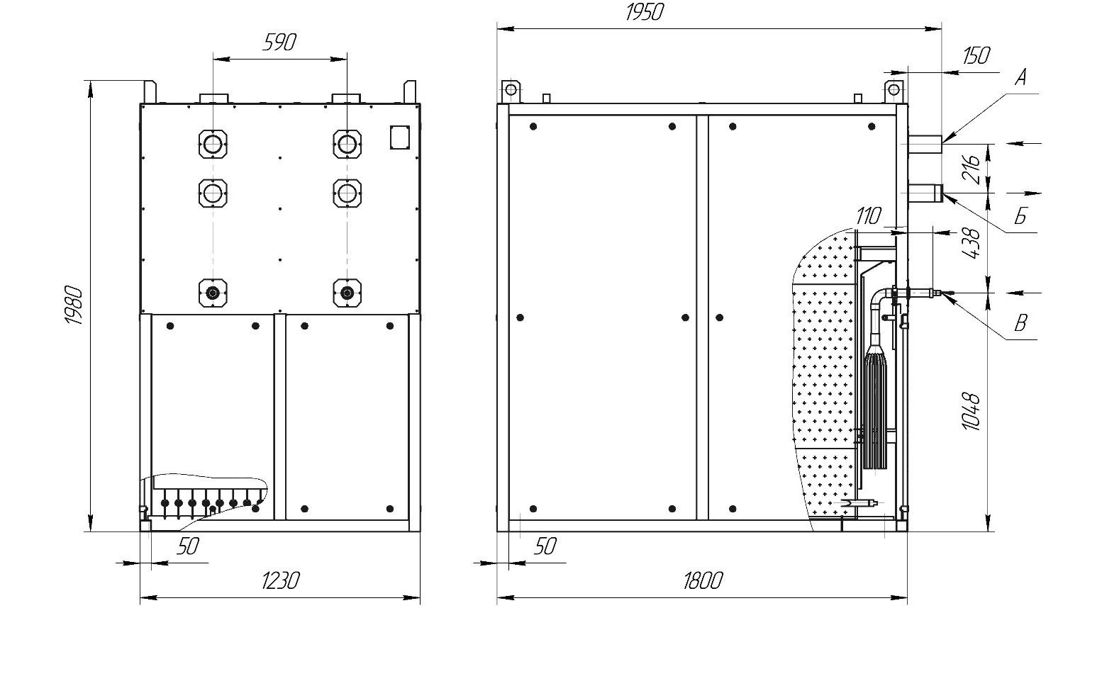 Пленочный испаритель предназначен для получения ледяной воды, которая используется в качестве хладоносителя в различных отраслях промышленности. Пленочные испарители – аппараты «открытого» типа с высоким коэффициентом теплопередачи и малой емкостью хладагента. Модуль охлаждения представляет собой конструкцию с вертикально установленными теплообменными панелями из нержавеющей стали и распределительного бака. Вода из распределительного бака равномерно стекает по поверхности теплообменных панелей в виде тонкой пленки, в располагаемый ниже накопительный бак. При этом вода охлаждается до температур, близких к 0°C, без риска размораживания теплообменного аппарата. Требуемый объем подачи воды обеспечивается конструкцией распределительного бака. Панель теплообменная представляет собой, два листа нержавеющей стали сваренных между собой контактной сваркой и сплошным швом. Качество сварных швов исключает возможность возникновения межкристаллической коррозии. Определенное количество точек сварки панели, обеспечивая высокую турбулентность потока при всегда высоком числе Рейнольдса, приводит к более высоким коэффициентам теплопередачи по сравнению с другими теплообменниками. И что самое главное, обеспечивает равномерное распределение водяной пленки на поверхности панели, исключающее ручьевое течение. После выполнения сварочных операций, избыточным давлением формируются выпукло-вогнутые поверхности, в результате чего, в теплообменной панели образуются полости в виде каналов, по которым проходит хладагент. Конструкция панели характеризуется малой емкостью (не более 5 дм3), что позволяет значительно сократить затраты на хладагент.